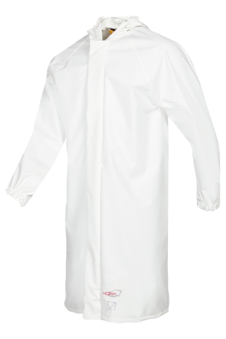 Onze lange Rigi jas met drukknoopsluiting werd speciaal ontwikkeld voor de voedingsnijverheid. Deze jas kan op 95°C gewassen worden voor een optimale hygiëne. De jas met vaste kap en elastische polsbanden houdt u dankzij de Flexothane® kwaliteit perfect droog.
