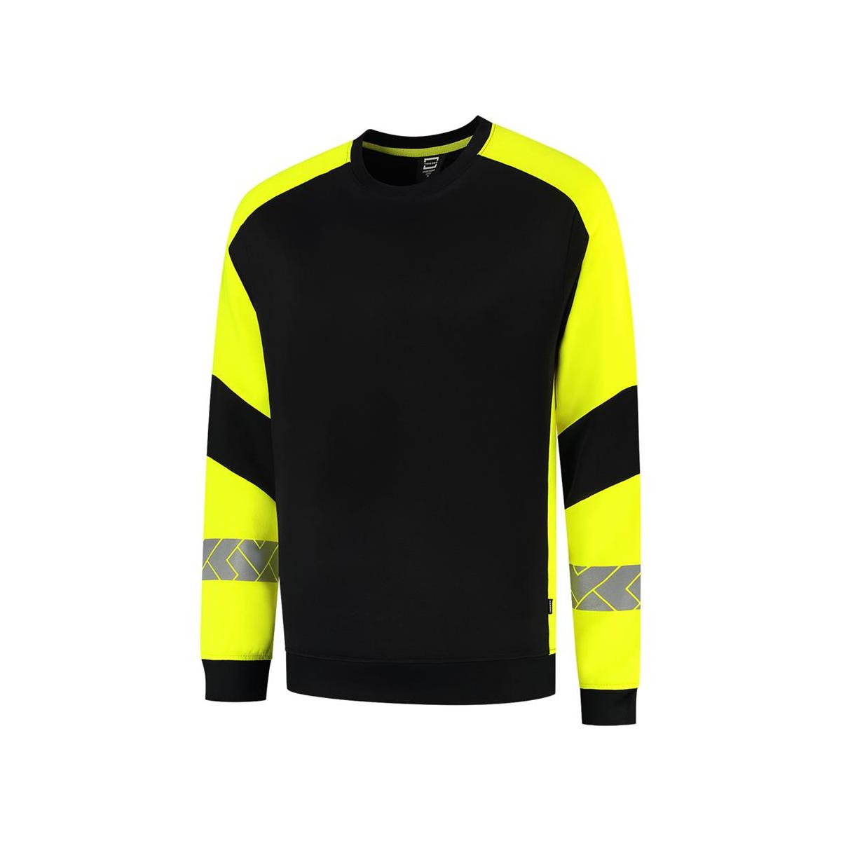 De Sweater Reflective Redefined van Tricorp is jouw betrouwbare partner voor zichtbaarheid én comfort op de werkvloer. Deze unisex sweater is gemaakt van 65% recycled polyester en 35% biologisch katoen en met een American fleece binnenkant, voelt de sweater zacht. Dankzij de gesegmenteerde reflectie op de mouwen en de rug blijf je zichtbaar bij dag én nacht volgens EN ISO 17535 normering voor medium risico. Met een doekgewicht van 280 g/m² en een regular fit zit de Sweater Reflective Redefined als gegoten. Dankzij de Polygiene® StayFresh-technologie blijft je sweater ook na intensief gebruik langer fris. De normering blijft tot wel 50 wasbeurten op 60 °C behouden, waardoor slijtage of verminderde zichtbaarheid geen zorg is. Perfect voor professionals in de bouw, logistiek of industrie die veiligheid en duurzaamheid willen combineren. Verkrijgbaar in maten XS tot en met 5XL en de kleuren Black-Fluor Yellow en Ink-Fluor Yellow. Combineer deze sweater met andere items uit de Reflective Redefined-lijn voor een complete, professionele en duurzame werkoutfit.